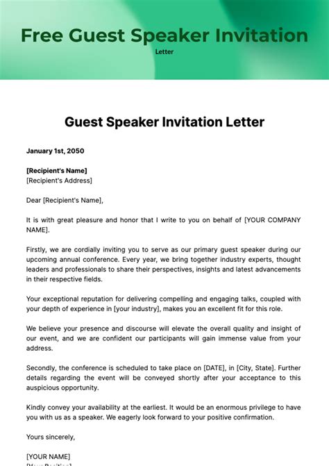 Invitation Letter Guest Speaker Template - Includes step by step instructions on how to write, tips, and sample letter. Customize and download this guest speaker invitation letter. At events, it is common to invite a guest speaker who is an honorable invite. Extend a warm welcome and inspire your audience. Enhance this design & content with free ai.